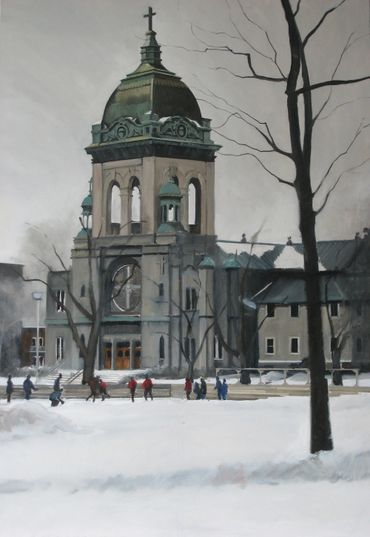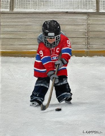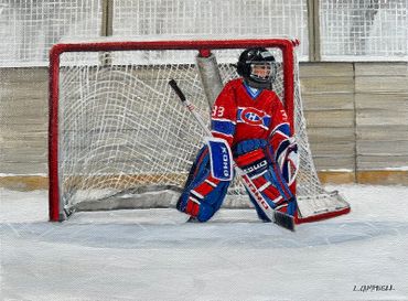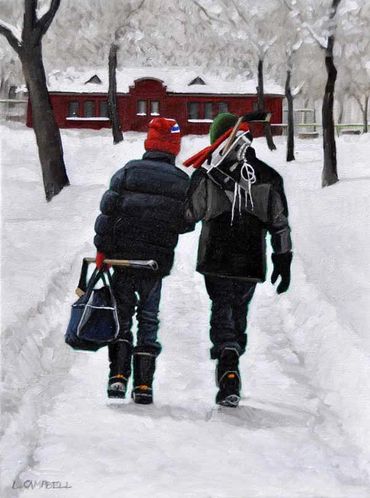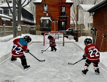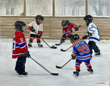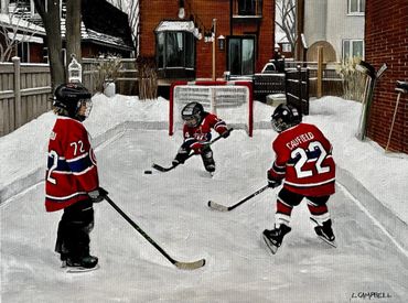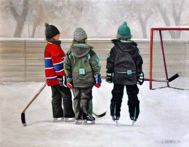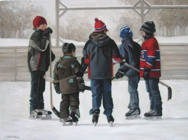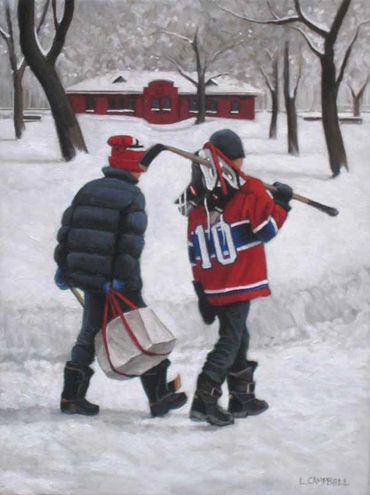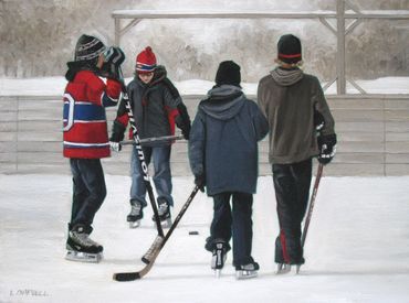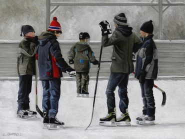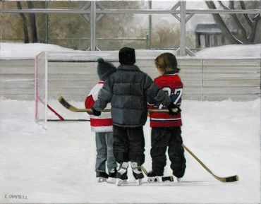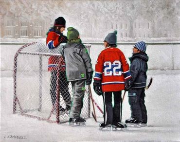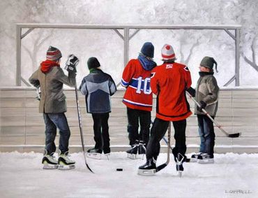 Park hockey. Original artwork by Canadian artist Laurie Campbell. Paintings are oil on canvas.